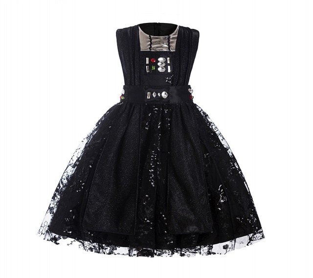 The dress features a fitted bodice, paying homage to Darth Vader’s imposing armor. It is crafted from high-quality black fabric with meticulous attention to detail, capturing the distinctive elements of Vader’s suit. The bodice may include printed or embroidered accents such as control panels or the Sith insignia, adding authenticity to the design.