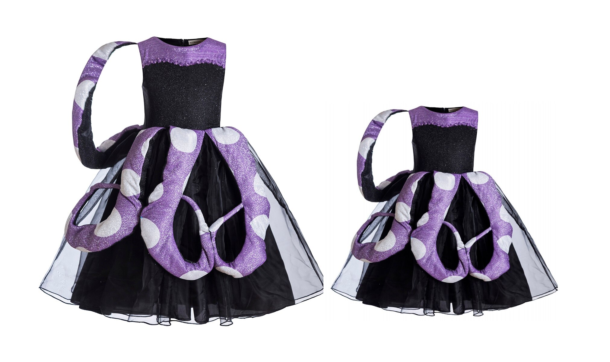 The skirt of the costume is a bold representation of Ursula’s sea-themed motifs. Crafted with layers of rich, flowing fabrics in shades of purple and black, it exudes a sense of grandeur and drama. Each step and movement commands attention, capturing the essence of Ursula’s theatrical personality.
